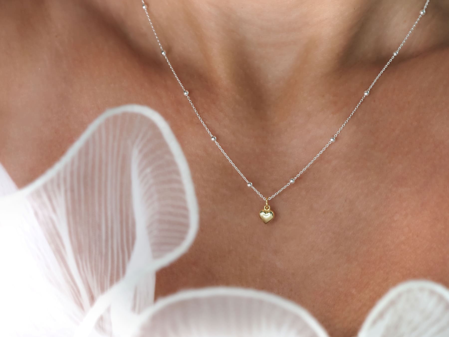 Eine leicht verspielte Komposition aus einer 925er Sterling Silberkette & einem Herzchen aus 333er Gold. Ich liebe den Material Mix, weil sie einfach jedem Outfit einen kleinen Eyecatcher verleiht und sowohl zu Silber- als auch zu Goldschmuck passt.