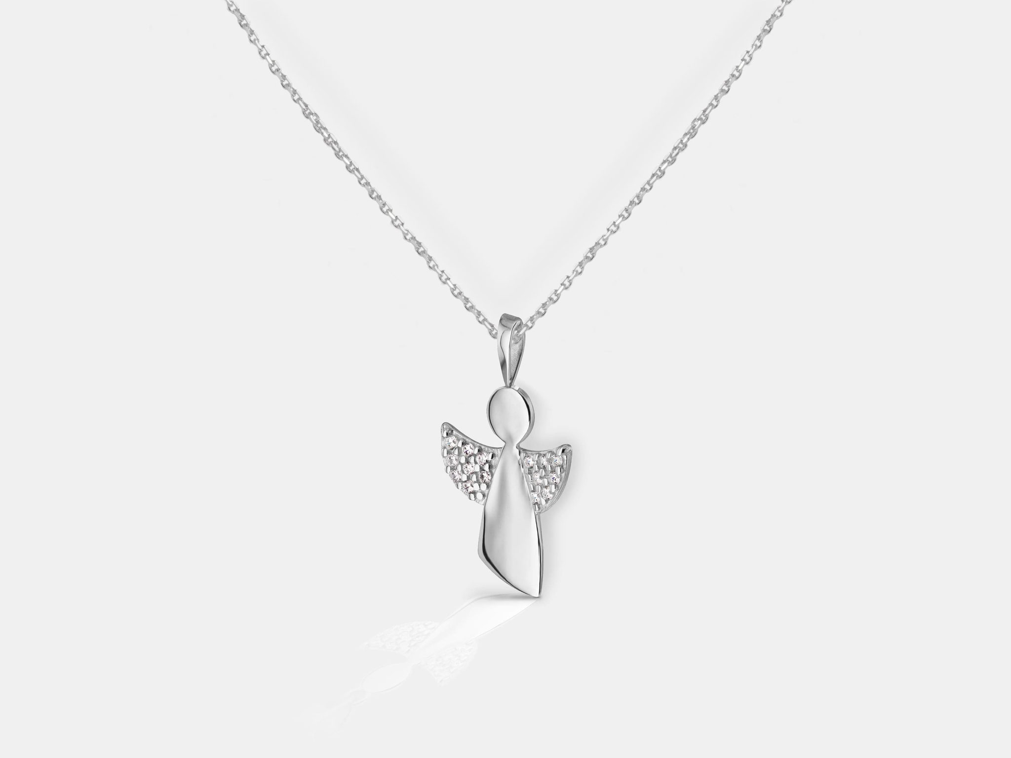 Dieser schlichte, flache und moderne Engel bewacht Deinen Lieblingsmenschen und ist ein ganz besonderes Geschenk von Herzen. Der Anhänger ist aus rhodiniertem 925er Sterling Silber gefertigt und glänzt durch die Kombination von Spiegelglanz-Politur sowie den kleinen Zirkonia Steinen auf den Flügeln wunderschön. Komplettiert wird er durch eine sehr feine zart glänzende Silberkette mit praktischer Längenverstellung. Ein sehr edles Schmuckstück, das sich auch hervorragend als Geschenk zur Taufe oder Konfirmation eignet. Direkt zum Verschenken verpackt in einer edlen Box mit Schleife.